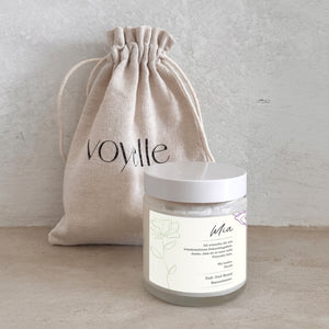 Erhältlich in verschiedenen Größen: 60ml und 120ml im Leinenbeutel, 180ml und 280ml in der luxuriösen Voyelle-Geschenkbox.